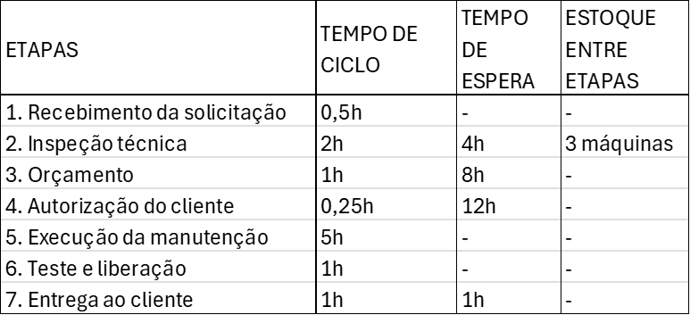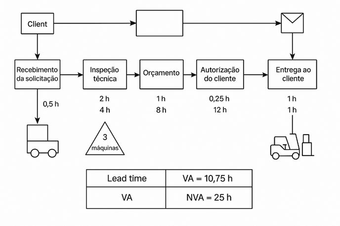 Um exemplo prático pode ser mostrado. Num processo de manutenção de empilhadeira, as seguintes etapas são desenvolvidas: