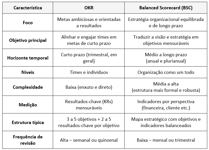OKR e Balanced Scorecard (BSC) não são exatamente concorrentes, mas sim metodologias complementares, com abordagens e propósitos diferentes. Dependendo do porte, maturidade e estratégia da empresa, ambas podem coexistir, ou uma pode ser mais adequada que a outra.